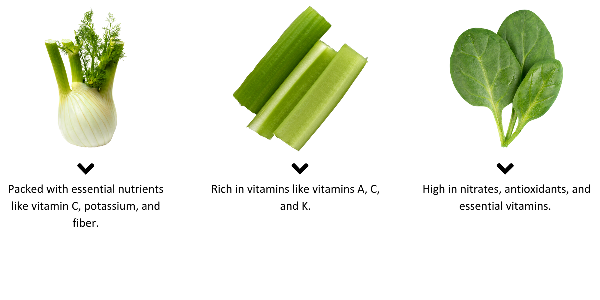 Spinach, Celery, Cucumber, Parsley, Fennel, Lemon, Ginger